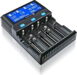 Univerzální nabíječka s mimořádně širokou kompatibilitou pro články Li‑ion, Li‑HV, LiFePO4 a Ni‑MH. Podporuje velikosti AA, AAA, C, D, 9V i Li‑ion články od 10440 až po 33600, včetně 20700/21700 s ochranou. Díky maximální délce saní 76 mm pohodlně nabijete i delší akumulátory.