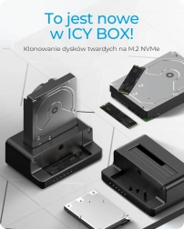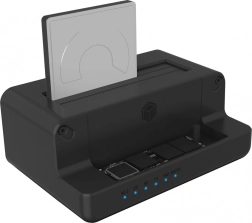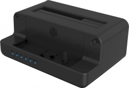 Stanice je vybavena kombinovaným USB kabelem s konektorem typu C a pevnou redukcí typu A, což zajišťuje flexibilitu připojení k hostitelským zařízením. LED indikátory ukazují stav klonování a aktivitu disků.