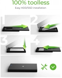 Instalace disků je 100% bez nástrojů - stačí otevřít víko, vložit disk, zavřít a můžete začít používat. Box podporuje 2,5-palcové disky SATA I/II/III s maximální výškou 9,5 mm, což zaručuje širokou škálu kompatibilních paměťových zařízení.