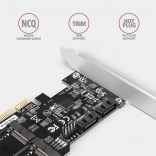 Díky rozhraní PCI‑Express 3.0 x2 získáte dostatečnou datovou propustnost až 4 GB/s pro plynulý přenos dat. Karta podporuje Hot‑Plug, NCQ, TRIM i Port Multiplier (Command Based Switching) a umožňuje bootování z připojených disků (BIOS/UEFI). Čtyři LED indikátory aktivity a header pro připojení LED diod skříně usnadní kontrolu provozu.