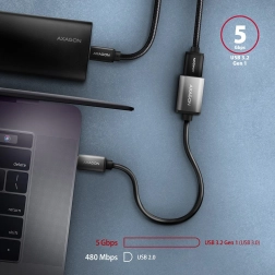 Kompaktní kabelový adaptér AXAGON RUCM-AFAC propojí zařízení s konektorem USB-A se všemi moderními zařízeními s USB-C. Nabízí rychlý přenos dat až 5 Gb/s, nabíjení proudem až 3 A a odolné hliníkové koncovky pro dlouhou životnost. Díky kvalitnímu stínění a pozlaceným kontaktům zaručuje stabilní a spolehlivé spojení doma i na cestách.
