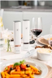 Stylový a výkonný elektrický mlýnek na koření, který spolehlivě namele sůl, pepř i další koření. Díky keramickému mechanismu a plynulému nastavení hrubosti dosáhnete vždy ideální chuti. LED osvětlení nasvítí dochucované jídlo a dobíjecí Li‑ion baterie s výkonným motorem zajistí dlouhou výdrž. Průhledové okénko usnadní kontrolu zásoby.