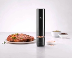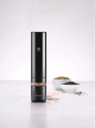 Elegantní elektrický mlýnek na koření ZWILLING ENFINIGY v černém provedení přináší rychlé a rovnoměrné mletí soli, pepře i směsí koření. O precizní výsledky se starají keramické mlecí kameny s dlouhou životností, plynulé nastavení hrubosti, výkonný motor a dobíjecí Li‑Ion akumulátor. Praktické LED osvětlení a průhledové okénko usnadní dochucování i kontrolu zásob.