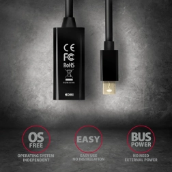 Kompaktní aktivní adaptér AXAGON z mini DisplayPort na HDMI umožní snadno připojit monitor, TV nebo projektor k počítači či notebooku s mini DP výstupem. Nabízí 4K rozlišení při 30 Hz, přenos obrazu i zvuku, bezdrátovou instalaci bez ovladačů a pozlacené konektory pro spolehlivý kontakt. Jednosměrná konverze z mini DisplayPort → HDMI je ideální, když již máte HDMI kabel a potřebujete pouze redukci.