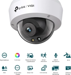 Profesionální dome IP kamera VIGI C240 s rozlišením 4MP přináší plnobarevný obraz 24/7, pokročilou AI detekci osob a vozidel, vestavěný mikrofon a odolnost IK10 a IP67. Podporuje H.265+, napájení PoE/12V DC, lokální záznam na microSD (až 256 GB) a flexibilní správu přes web, NVR a aplikaci VIGI.