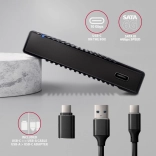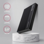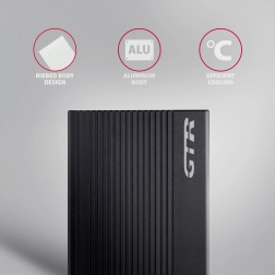 Použití žebrovaného hliníkového pouzdra přispívá k účinnému chlazení a ochraně disku, zatímco gumové nožky zajišťují stabilitu na povrchu. Elegantní design navíc zabraňuje nežádoucím otiskům prstů.