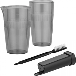 Obsahuje dva odměrné poháry, čistící kartáček a držák na příslušenství pro organizovanější skladování.
