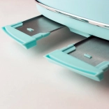 Stylový toustovač z nerezové oceli v tyrkysové barvě připraví křupavé toasty během chvilky. Má 4 extra široké štěrbiny, funkci centrování pro rovnoměrné propečení a 6 úrovní opékání. Nabízí rozmrazování, ohřívání i okamžité přerušení chodu. Samovypínání, vyjímatelný tácek na drobky, protiskluzové nožky a schovka na kabel usnadní každodenní použití i údržbu.