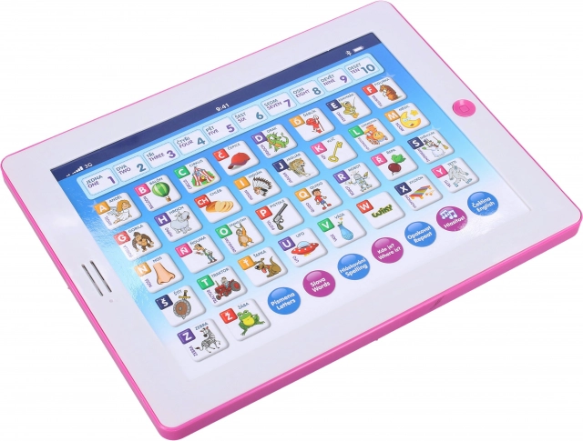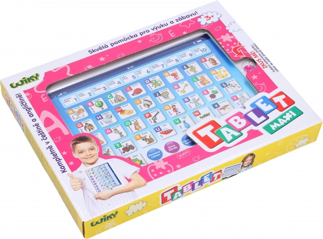 Růžový dětský výukový tablet WIKY maxi. Učí abecedu a počítání 1–10 česky i anglicky, zábavné hry. 3× AAA baterie v balení. Pro děti od 3 let.