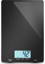 Tato tenká a stylová digitální váha Lafe je navržena pro přesné měření surovin s rychlým odečtem na velkém podsvíceném displeji. Dotyková tlačítka zajišťují pohodlné ovládání, funkce tara umožní vážit suroviny postupně v jedné misce a speciální režimy pro vodu a mléko usnadní přípravu receptů.