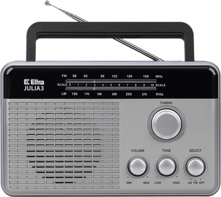 Kompaktní stolní rádio Julia 3 ve stříbrném provedení nabízí velkou a přehlednou stupnici, pohodlné ladění a jemnou regulaci hlasitosti. Potěší také regulace barvy zvuku, otočná teleskopická anténa, sluchátkový výstup a duální napájení ze sítě i baterií.