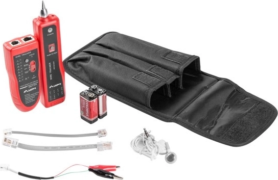 Tester zahrnuje vysílač a přijímač umožňující testování continuity kabelů a sledování vodičů s klíčovými RJ45 porty.