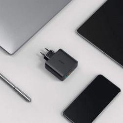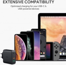 Nabíjejte rychle a efektivně svá zařízení s nabíječkou AUKEY PA-D3. Dva porty – USB-C Power Delivery a USB-A – pokryjí vše od mobilů a sluchátek až po výkonnější zařízení, včetně notebooků a monitorů napájených přes USB-C. Technologie Dynamic Detect inteligentně přidělí výkon: při jednom připojeném zařízení až 60 W, při dvou zařízeních optimalizuje rozdělení (např. až 45 W pro primární port), a zajišťuje tak rychlé a bezpečné nabíjení.