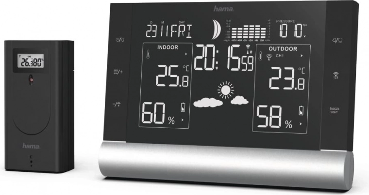 - Teploměr a vlhkoměr pro zobrazení teploty a vlhkosti uvnitř i venku.