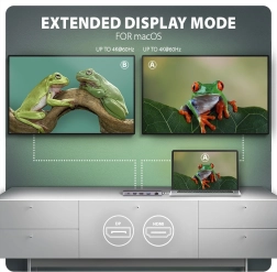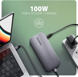 Vytvořte si kompaktní pracovní stanici jedním kabelem. Hub nabídne 3× USB-A (2× 5 Gb/s, 1× 10 Gb/s) a 1× USB-C 10 Gb/s pro rychlé periferie i externí disky. Obraz připojíte přes HDMI a DisplayPort až 4K/60 Hz – a to jednotlivě nebo současně, včetně podpory HDR a vysokých herních frekvencí (2K/144 Hz, Full HD/240 Hz). Samostatný port USB-C PD 100 W průchozím napájením ušetří port ve vašem notebooku.