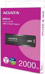 ADATA SC610 je kompaktní a přenosný externí SSD disk s vysokou kapacitou 2000 GB. Díky podpoře USB 3.2 Gen2 dosahuje propustnosti až 10 Gb za sekundu, což umožňuje rychlé a efektivní přenosy dat.