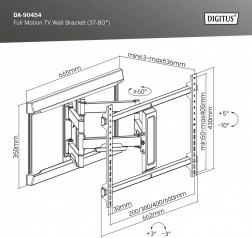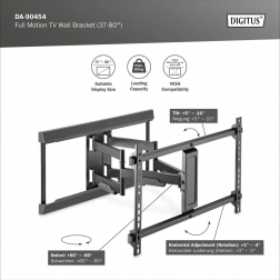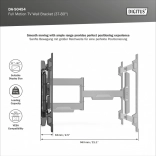 Držák nabízí výsuvné rameno s rozsahem od 6,3 do 53,6 cm, což umožňuje optimální nastavení úhlu pro ideální sledování. Možnost otáčení v rozsahu od +60 do -60° a náklon od +5 do -10° poskytují přizpůsobitelnost podle potřeb uživatele. Horizontální rotace v rozpětí +3 až -3° zajišťuje přesné umístění obrazovky.