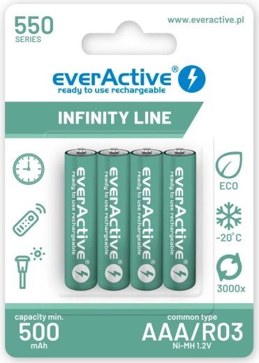 Sada 4 akumulátorů AAA R03 s kapacitou 550 mAh v technologii ready to use pro okamžité použití. Řada Infinity Line je ideální pro solární lampy, bezdrátové telefony a další zařízení s nízkou až střední spotřebou, kde skvěle nahrazují jednorázové baterie a přinášejí ekonomickou i ekologickou úsporu.
