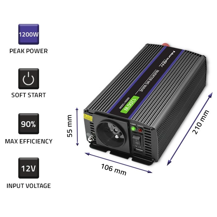 Robustní, přitom lehké hliníkové šasi odolá otřesům a mechanickému namáhání. Integrovaná EU zásuvka, USB port a automatický ventilátor zvyšují komfort používání. Měnič je ideální pro karavany, přívěsy, lodě a jachty, ale poslouží i jako nouzový zdroj (UPS) pro dočasné udržení chodu RTV a kancelářské techniky během výpadků proudu.