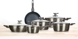Kompletní sada nádobí pro každodenní vaření i náročné recepty. Obsahuje hrnce a pánve z litého hliníku s tvrdým nepřilnavým povrchem odolným proti poškrábání, plně indukčním dnem a skleněnými poklicemi se nerezovými úchyty. Díky vysoké tepelné vodivosti vaří rychle a úsporně a dlouho udržuje teplotu.
