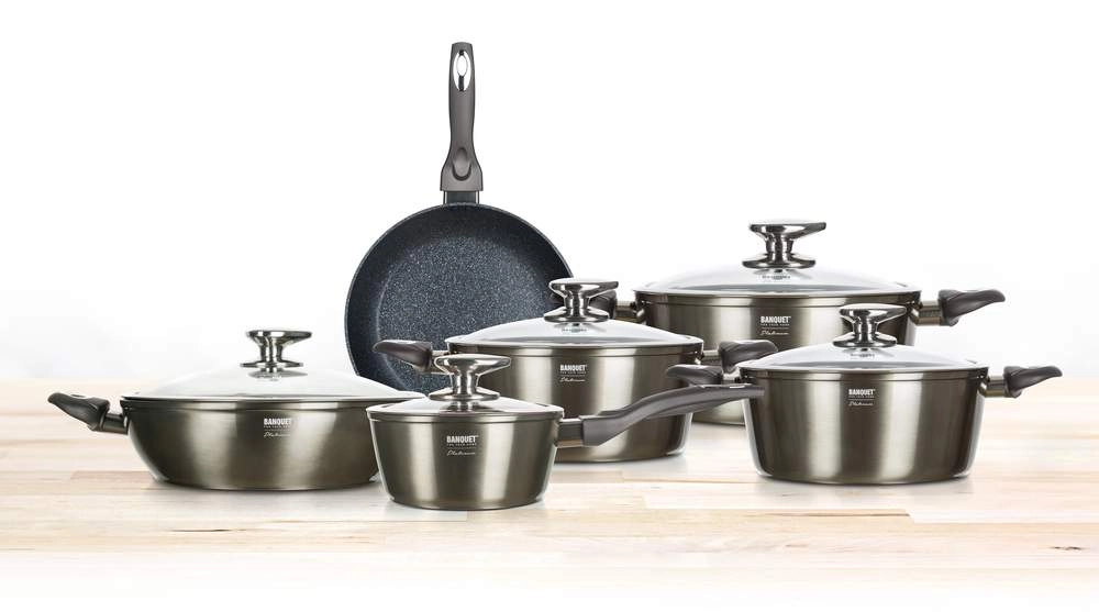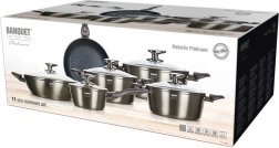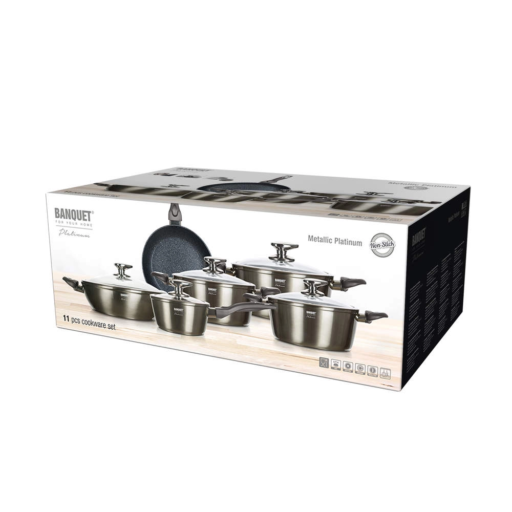 Sada hrnců BANQUET Metallic Platinum v 11dílném provedení pokryje všechny vaše kuchařské potřeby. Litý hliník s kvalitní nepřilnavou vrstvou je odolný vůči nárazům a deformacím, přičemž hladký povrch umožňuje vaření s minimem tuku a snadné čištění – i v myčce.