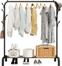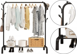 Tento volně stojící věšák na šaty a kabáty nabízí velkorysý prostor pro zavěšení oděvů a zároveň praktickou polici pro uložení obuvi, krabic či košíků. Robustní rám ze stalových trubek s černou povrchovou úpravou zajišťuje dlouhou životnost a elegantní minimalistický design, který se hodí do každého interiéru.