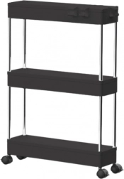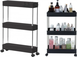 Praktický pojízdný regál se 3 policemi v elegantní černé barvě pro snadnou organizaci v kuchyni, koupelně i obýváku. Díky kompaktním rozměrům, mobilní konstrukci na kolečkách a stabilnímu provedení z kovu a odolného plastu nabídne přehledné uložení koření, kosmetiky, knih i dekorací.