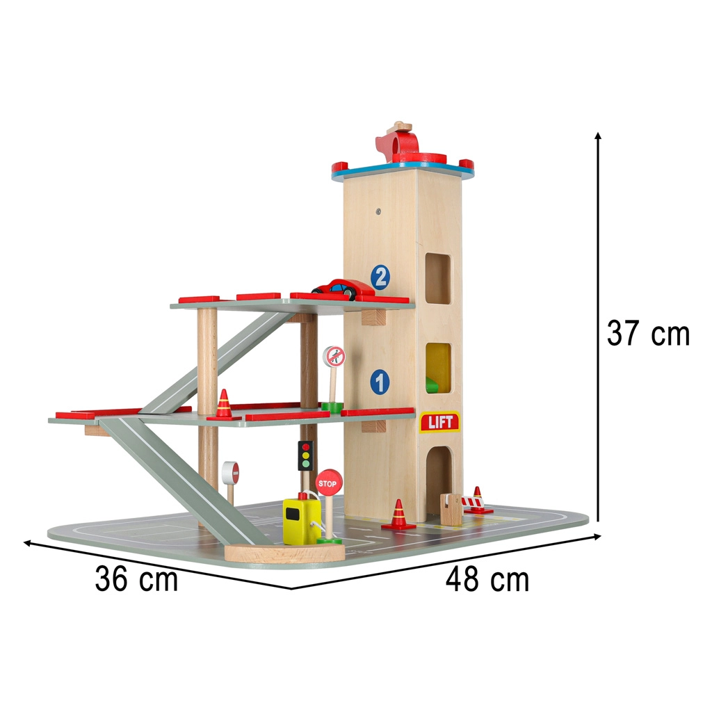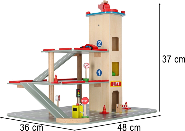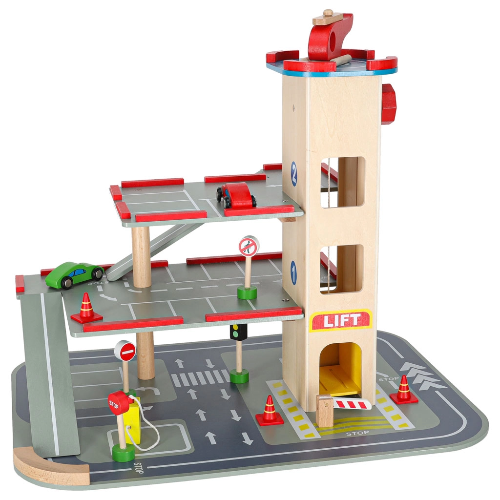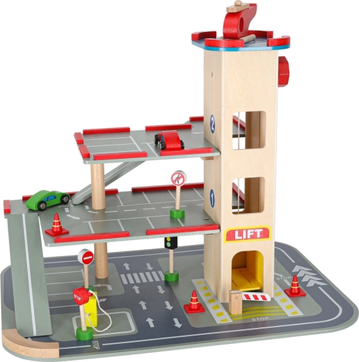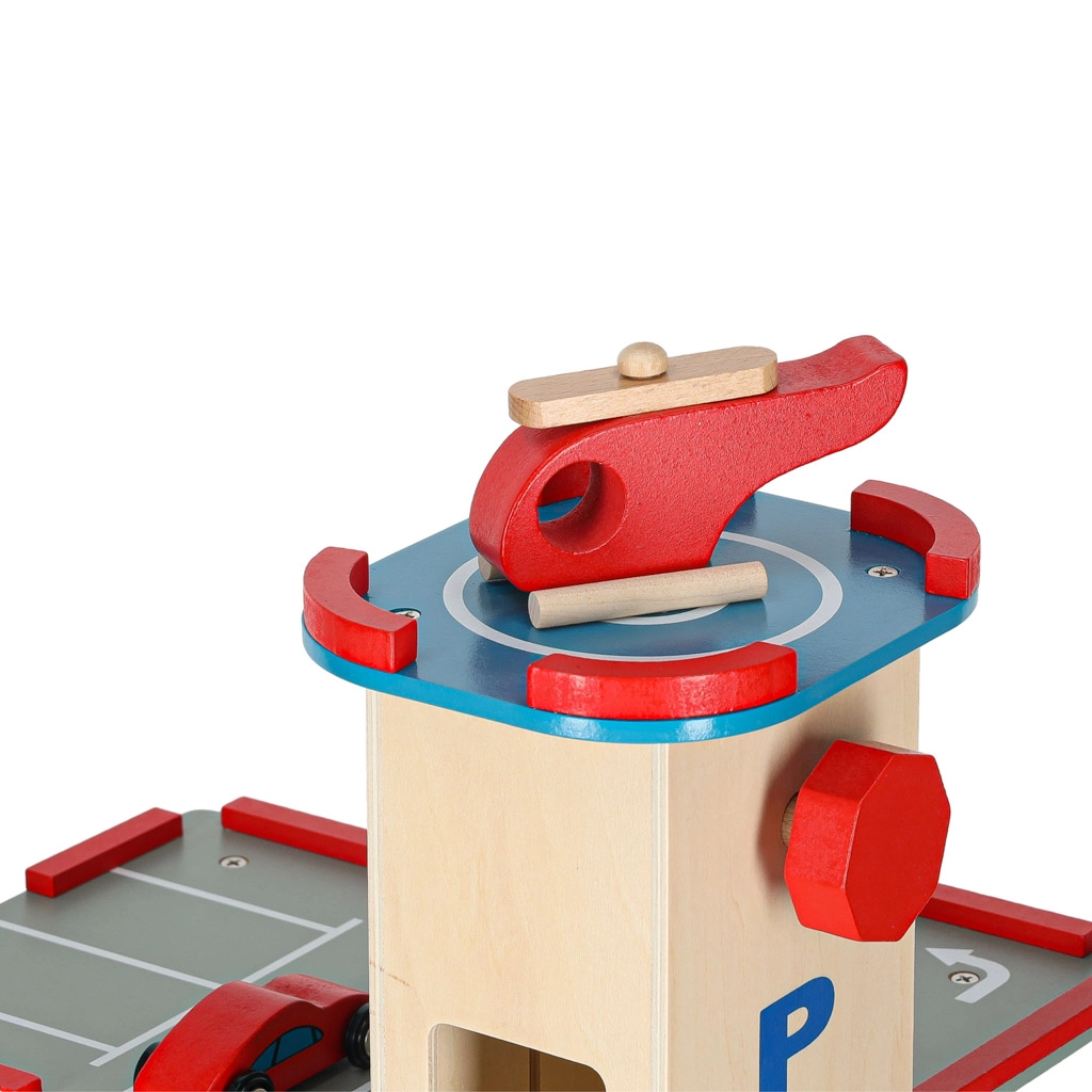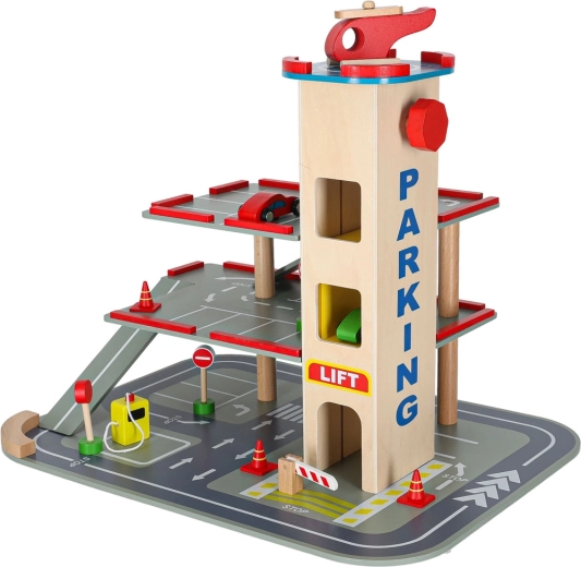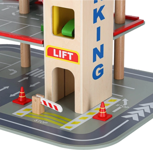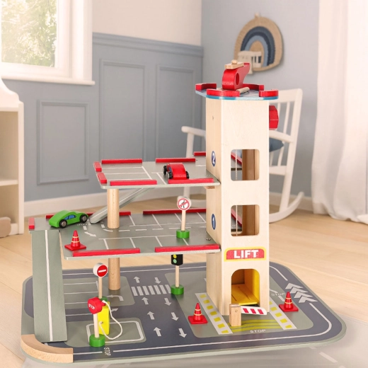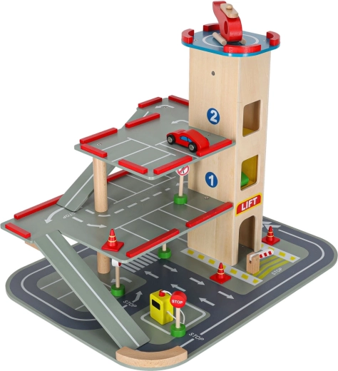 Tato kvalitní dřevěná garáž nabízí až 4 úrovně zábavy: tři patra pro parkování a střešní heliport. Díky ručně ovládanému výtahu děti snadno přesunou autíčka mezi patry a mohou využívat i plynulé rampy. Set je ideální pro rozvoj jemné motoriky, fantazie a učení se pravidlům silničního provozu.