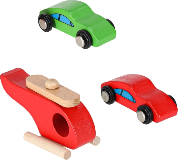 Součástí balení je bohaté příslušenství: 2 dřevěná autíčka s volně běžícími kolečky, helikoptéra s točící se vrtulí, 4 dopravní značky, 3 kužely a palivový stojan. Všechny díly jsou vyrobeny z hladce broušeného dřeva a lakovány netoxickými barvami pro bezpečnou hru.