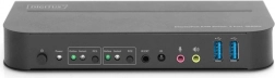 Digitus KVM přepínač umožňuje připojit dva počítače přes 2× DisplayPort a sdílet jeden monitor, klávesnici a myš. Výstup lze vést přes HDMI 2.0 nebo DisplayPort 1.2 s rozlišením 4K@60 Hz, včetně podpory HDCP 2.2, HDR a FreeSync. Přepínat lze tlačítkem na čelním panelu nebo pomocí přibaleného IR dálkového přijímače.