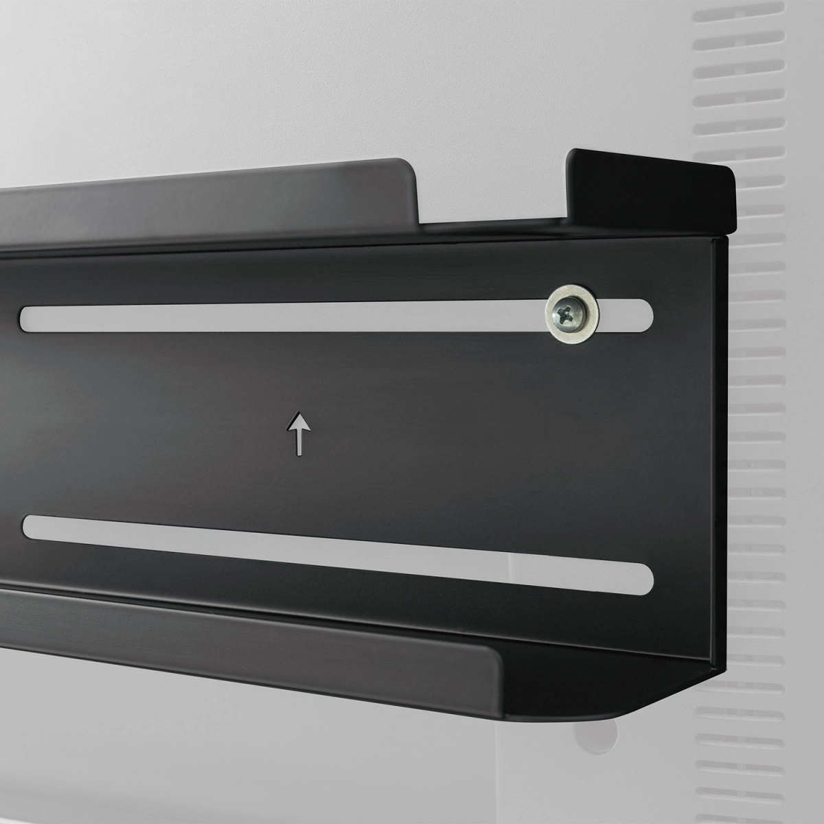 Instalujte poličku pohodlně na stěnu nebo na zadní panel televizoru. V balení jsou připravené montážní otvory a sloty pro rychlé a jisté upevnění.