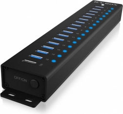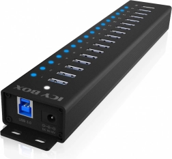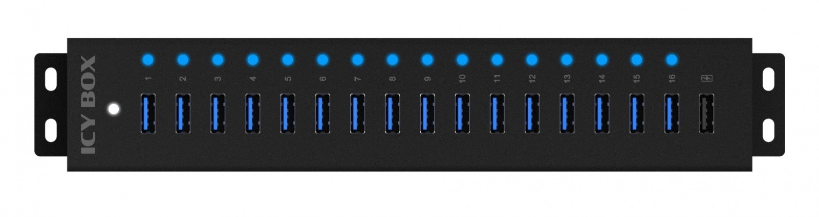ICY BOX IB-HUB1717 je výkonný 17portový USB hub navržený pro pracovní stanice, servery, dílny i studia. Nabízí 16 portů USB 3.2 Gen 1 Type‑A pro datové přenosy až 5 Gb/s na každém portu a jeden vyhrazený port USB‑A pro rychlé nabíjení mobilních zařízení. Robustní celokovové šasi z hliníku zajišťuje spolehlivost a účinné odvodnění tepla i v náročných podmínkách.