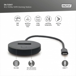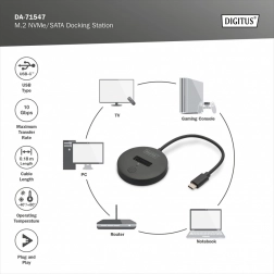 Dokovací stanice DIGITUS umožňuje spravovat a rozšiřovat úložiště pomocí SSD M.2 standardů NVMe (B+M Key / M-Key) i SATA (B+M Key). Díky rozhraní USB‑C 3.2 Gen2 dosáhnete rychlostí až 10 Gbps, takže přenos velkých souborů, zálohování i práce s multimédii je rychlá a plynulá.