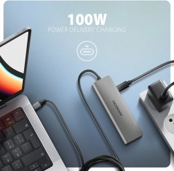 Hliníkové šasi zvyšuje odolnost a napomáhá chlazení. Hub podporuje Plug & Play, Hot Plug i připojení k telefonům s USB‑C. Snadno zapojíte flash disk, klávesnici, myš, externí disky nebo monitor/TV/projektor.