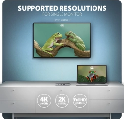 - Výkonné video: 4K/60 Hz, 2K/120 Hz, Full HD/240 Hz, HDR, HDCP 1.4/2.3 (vyžaduje USB‑C s DP Alt Mode 1.4+ nebo Thunderbolt 3/4).