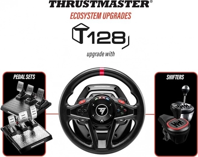 Závodní volant T128 je vybaven systémem HYBRID DRIVE, který díky použití mechanismu s pásy a ozubenými kolečky poskytuje realističtější a univerzálnější zpětnou vazbu sil. O 20 % vyšší výkon v porovnání s předchozími hybridními volanty Thrustmaster TMX vám umožní zažít autentické pocity a usnadní optimalizaci trasy. Nejnovější pás s 4-barevnými diodami vám umožňuje sledovat otáčky motoru a kdy je třeba přeřadit. Montážní systém s nastavitelnou svorkou zjednodušuje rychlé a jednoduché uchycení na různé tloušťky stolů a psacích stolů. Sada pedálů T2PM, dodávaná s volantem, je vybavena patentovanou technologií bez tření magnetických senzorů, které zajišťují dlouhodobou vysokou přesnost.