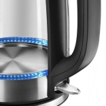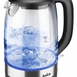 Skleněná rychlovarná konvice AMICA o objemu 1,7 l spojuje moderní design a vysokou odolnost. Díky borosilikátovému sklu je odolná vůči teplotním šokům, má LED podsvícení pro atraktivní efekt při varu a spolehlivý ovladač STRIX/OTTER pro dlouhou životnost. Nechybí 360° otočná základna, vyjímatelný filtr proti vodnímu kameni a pohodlné otevírání EasyOpen tlačítkem v rukojeti.