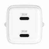 - Dva výstupní porty umožňují současné napájení dvou zařízení. Jediný port dosáhne výkonu až 35W, při současném používání 17W pro C1 a 18W pro C2.