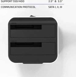 Naše stolní dokovací stanice nabízí možnost připojit dva disky (SSD nebo HDD) současně, podporující velikosti 2.5'' a 3.5''. Díky gumovým nožkám je zajištěna stabilita zařízení. Instalace je snadná díky funkci Plug & Play, takže žádné speciální technické dovednosti nejsou potřeba.