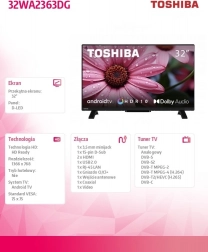 Užijte si oblíbené filmy, seriály a sport na kompaktní 32" obrazovce s čistým HD obrazem a chytrými funkcemi. Televize TOSHIBA 32WA2363DG nabízí živé barvy, štíhlý design, bohaté možnosti připojení a snadný přístup ke streamovacím aplikacím – ideální do obýváku, ložnice i na chatu.