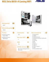 Základní deska ROG STRIX B650-A Gaming WiFi přináší vysoký výkon, špičkovou tepelnou odolnost a moderní výbavu pro sestavy s procesory AMD Ryzen 7000. Nabízí PCIe 5.0 M.2, rychlé DDR5 moduly a Wi‑Fi 6E pro bleskové připojení – to vše v atraktivním černo‑stříbrném provedení STRIX.