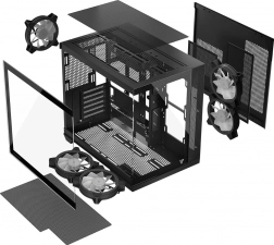 Podpora základních desek s obrácenými konektory, dvoukomorové uspořádání a snadný přístup díky bočnicím na zacvaknutí zjednoduší stavbu i cable-management.