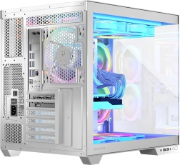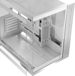 Dvoukomorové řešení se svisle umístěným zdrojem odděluje servisní část, což zlepšuje kabelový management a estetiku. Skříň je připravena na desky ATX / mATX / ITX i na moderní desky s otočenými konektory, nabízí prostor pro grafické karty do 400 mm a chladiče CPU do 175 mm a podporuje kapalinové chlazení s radiátory 360 mm nahoře i dole.