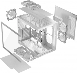 Stylová bílá miditower skříň s panoramatickým tvrzeným sklem nabízí 7× předinstalovaných ARGB ventilátorů a přibalený řadič pro až 9 ventilátorů. Dvoukomorová konstrukce s podporou desek s obrácenými konektory, špičkové proudění vzduchu, prostor pro GPU až 400 mm a chladič CPU 175 mm i podporu radiátorů 360 mm nahoře i dole. Nechybí USB‑C, filtry proti prachu a bezšroubové bočnice na zacvaknutí.