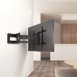 Robustní kovová konstrukce s práškovým lakováním v černé barvě zajišťuje stabilitu a dlouhou životnost. Díky velmi dlouhému, dvojitému rameni nastavíte televizor přesně podle potřeby – od vytažení od stěny po natočení a náklon pro ideální sledovací úhel. Po instalaci navíc snadno dorovnáte horizont (+5/−5°).