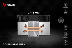 Chladič Savio Frost X2 nabízí vynikající chlazení díky dvěma 6mm měděným heatpipe trubicím, které jsou v přímém kontaktu s procesorem a rychle přenášejí teplo do hliníkového radiátoru. O výkon chladícího systému se stará 120mm ventilátor s regulovatelnými otáčkami od 800 do 1800 RPM, připojený přes 4pinový konektor s podporou PWM. Tato technologie automaticky přizpůsobuje rychlost ventilátoru podle teploty, což zajišťuje tichý provoz a energetickou efektivitu.