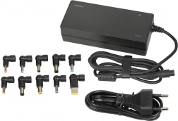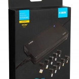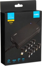 Univerzální napájecí adaptér pro notebooky s výkonem 120 W a automatickým nastavením proudu pomocí mikroprocesoru. Obsahuje 10 výměnných koncovek pro širokou kompatibilitu (ACER, ASUS, COMPAQ, DELL, HP, IBM, LENOVO, LG, SAMSUNG, TOSHIBA). Nabízí aktivní PFC pro úsporu energie a pokročilá zabezpečení OCP/OPP/SCP/OTP pro bezpečné nabíjení.