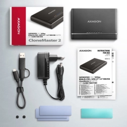AXAGON CLONE MASTER 2 je praktické řešení pro zálohování, migraci i testování disků. Díky rychlému rozhraní USB 3.2 Gen 2 (10Gbps) a reálné propustnosti až kolem 1 000 MB/s zvládne rychlé přenosy dat. NVMe M.2 disk vložíte bez šroubků, 2.5"/3.5" SATA disky připojíte přímo do portu SATA na adaptéru. Směr klonování lze přepínačem měnit mezi NVMe M.2 → SATA a SATA → NVMe M.2.
