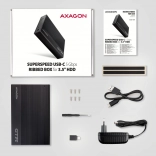 Součástí balení je kabel USB-C na USB-A o délce 80 cm a adaptér USB-A na USB-C. Pouzdro je napájeno kompaktním AC/DC adaptérem a vybaveno LED indikátorem pro připojení a přenos dat.