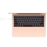 Zlatý notebook s moderním designem ukazuje, jak adaptér vypadá při připojení ke stylovému zařízení, což posiluje jeho estetickou hodnotu.